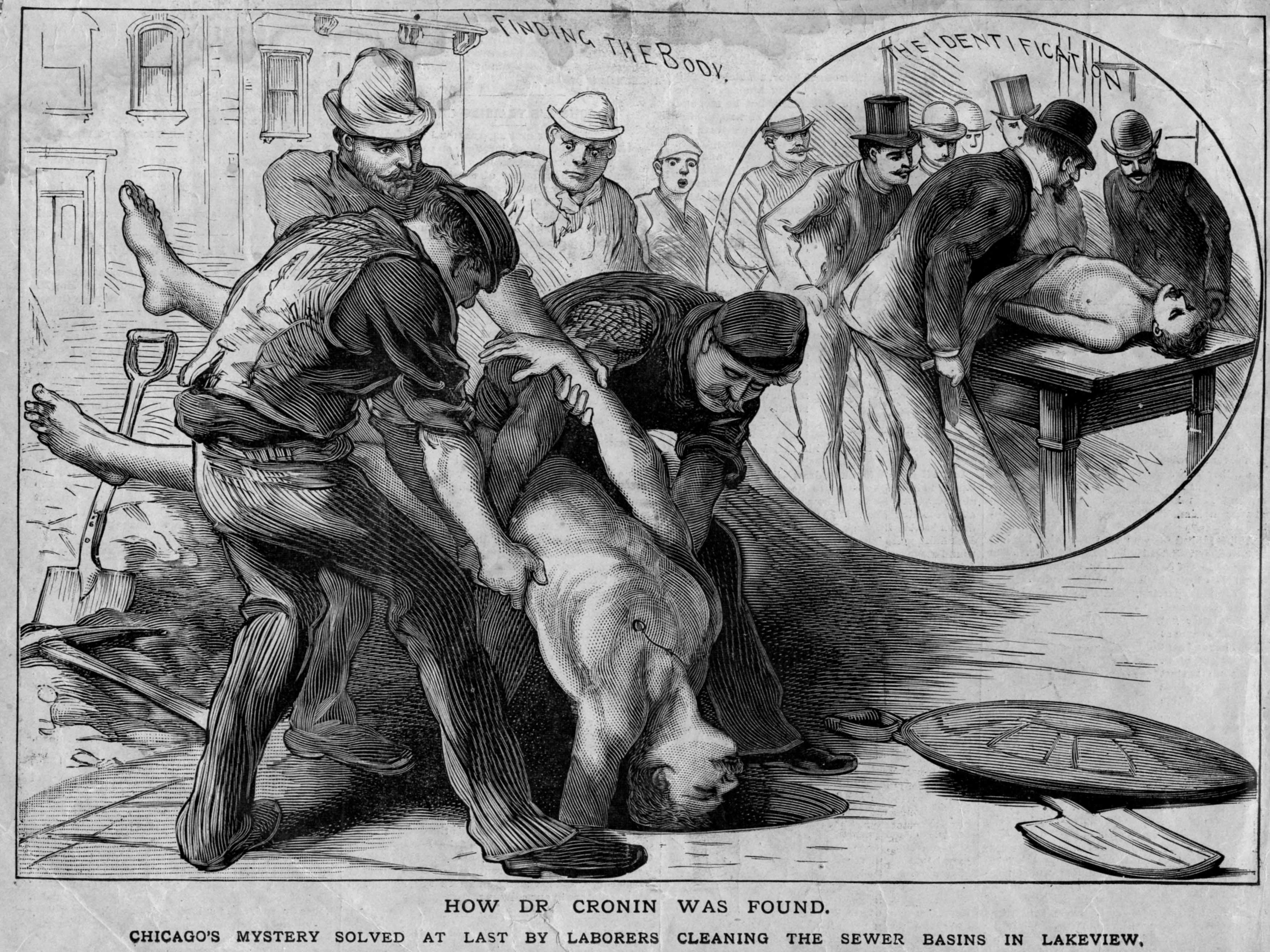 All speculation ended on 22 May when employees of the Board of Public Works were dispatched to investigate the source of a putrid smell coming from a sewer in Lake View. Peering through the bars of the sewer, the workers saw the swollen body of a naked man. A bloody towel was draped around the corpse’s neck and he had been stripped of all belongings, with the exception of an Agnus Dei medallion, a Catholic sacramental believed to safeguard the wearer against harm. It was immediately assumed that the body was Cronin’s, and within hours the Conklins identified his body in the morgue of Lake View police station.