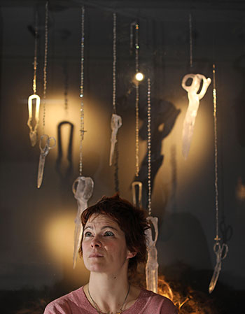 Above: Artist Alison Lowry explores issues of gender, institutional abuse and domestic violence—here with an installation of glass scissors and human hair.