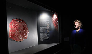 The exhibition space itself is darkened, winding and at times claustrophobic, all contributing to the solemn and contemplative atmosphere required of such a heavy subject. Relatively small in relation to the museum’s larger permanent exhibits, Lowry’s installation marks a departure from the standard museological pairing of physical artefact with historical narrative. As an undertaking of contemporary art, this exhibition would seem to fit more comfortably into one of the high-profile art galleries in Dublin, such as the Hugh Lane or IMMA. This choice of venue draws attention, however, to the history of museums as a colonial project, and more specifically the institutional linkages between Victorian-era centres of containment (laundries, schools and homes) and museological collecting practices. This museum, as a site for the decorative arts, invites comparisons with the history of women’s creative production, traditionally relegated to the meagre category of craft rather than perceived as equivalent to the ‘high arts’ of painting and sculpture. Lowry draws attention to this gendered division by elevating textiles to the level of sculpture through the manufacture of sartorial objects such as gowns and sweaters in the medium of glass. More importantly, the focus on textiles provides a formal allusion to the forced and unpaid work of women who laboured in the laundries and who created craft objects and embroideries that could be sold for profit by the institutions in which they were housed.