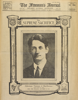 On 26 October 1920 the Freeman’s Journal devoted its front page to the Sinn Féin lord mayor of Cork, Terence J. MacSwiney, who had died the previous day in Brixton Prison, London, after a hunger strike lasting 74 days. A photograph of the dead man, suitably adorned with well-known Celtic motifs, bore the legend ‘The Supreme Sacrifice’. Elected lord mayor of Cork in March 1920, MacSwiney was arrested in August by the British on charges of sedition and imprisoned in Brixton Prison. His death would bring him and the Irish struggle to international attention; there were demonstrations as far afield as Berlin and Buenos Aires.