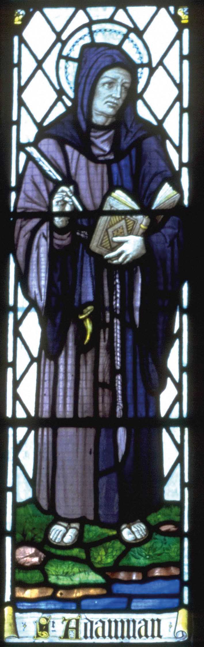 Stained glass window of Adomnán in St John the Baptist’s Church, St John’s, Isle of Man. (Frances Coakley)