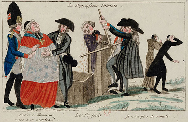 Above: A contemporary French cartoon depicting Le Degraisseur Patriote (‘the patriotic de-fattening machine’). Revolutionary images such as this terrified Moylan and the Irish hierarchy.