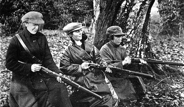 Above: Cumann na mBan members Linda Kearns, Eithne Coyle and Mae Burke pose with rifles at an IRA training camp at Ducket’s Grove, Co. Carlow, in October 1921. (Mercier Press)