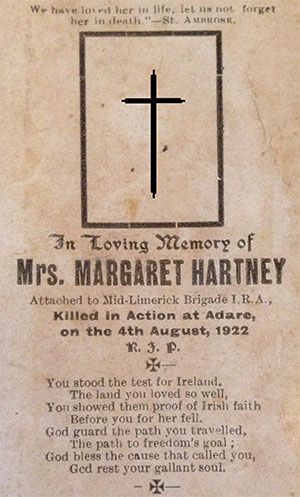 Above: Memorial card of Mary Hartney, the first Cumann na mBan member killed in the Civil War on 4 August 1922 at Adare, Co. Limerick.