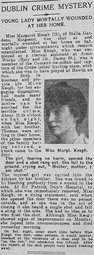 Top: Margaret Keogh, fatally wounded at Stella Gardens, Ringsend, during a series of raids by Crown forces on the eve of the Truce.