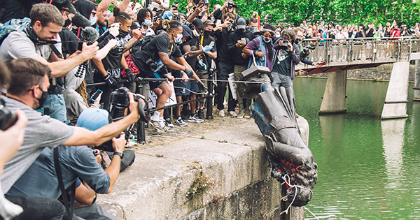 Above: The statue of slave-trader Edward Colston being pushed into the River Avon in Bristol on 7 June 2020. (Getty Images)
