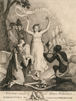 Above: ‘Hibernia attended by her Brave Volunteers, Exhibiting Her Commercial Freedom’—1780 print by William Hincks. ‘Free trade’ also meant freedom to enter the slave-trade. (NLI)
