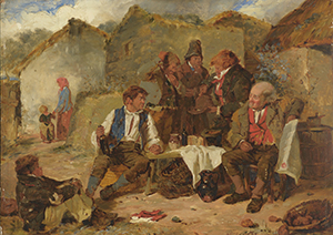 Even decades after the catastrophe, artists found it difficult to paint graphic representations of what happened. The occasional eviction scene or ruined cottage appears, but the Famine continues to be mainly addressed by metaphor and allegory, with emigration scenes being most common. It is startling to see paintings from the late nineteenth century that depict Ireland as a land of happy peasants or sturdy farmers,but even these sanitised images of well-fed people in neat cottages dancing to a piper or fiddler cannot disguise the level of poverty. Furniture might be clean and sparkling but there is very little of it; the people are brightly dressed but closer inspection reveals clothes that have been patched and mended over years.