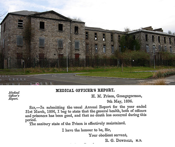 Top: Part of the ruin of Grangegorman Female Prison, where Dr Dowdall had been ‘artificially feeding’ inmates since 1895. He was the prison medical officer at Mountjoy in 1917. Above: Dr Raymond Granville Dowdall’s report to the General Prison Board for the year ended 31 March 1896 was perfunctory and made no mention of his ‘management’ of Ellen Shea.
