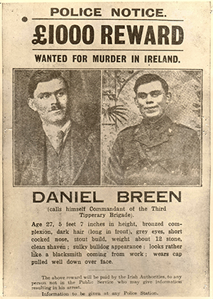 For IRA men on the run during the War of Independence, photographs of them were dangerous objects, liable to be seized by the authorities and printed in the Hue-and-Cry and on ‘wanted’ posters, such as this one for Dan Breen of the 3rd Tipperary Brigade, printed by Alex Thom & Co. in November 1920.