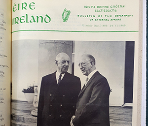 Above: General Charles de Gaulle and President Éamon de Valera outside Áras an Uachtaráin, as depicted on the cover of Éire Ireland, the bulletin of the Department of External Affairs, 24 June 1969. (Department of Foreign Affairs and Trade)