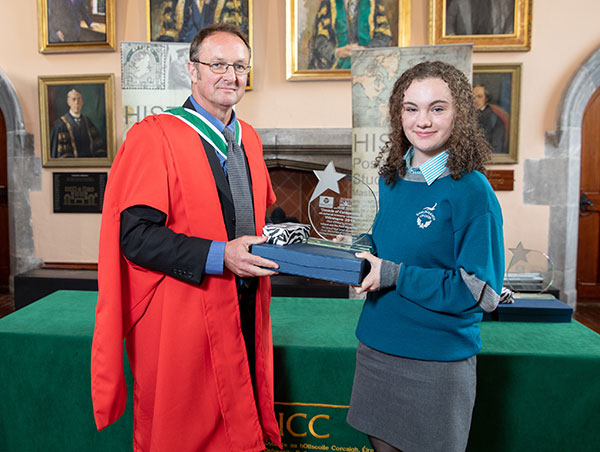 Above: Saoirse Ní Shiocháin receiving her award from Prof. David Ryan, Head of the School of History, at the Decade of Centenaries essay competition prize-giving ceremony in UCC in May 2018.