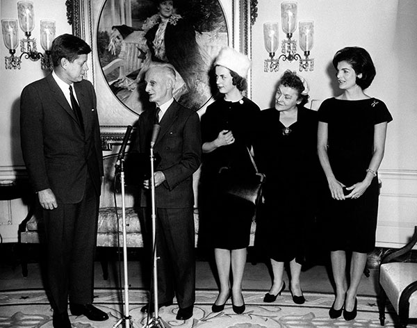 Above: Delia Murphy—with air hostess Margaret Teresa Ryan in front and Jacqueline Kennedy behind—looks on as her husband, Irish Ambassador Thomas Kiernan, makes a presentation in the White House to newly elected US President John F. Kennedy in January 1961. (Alamy)
