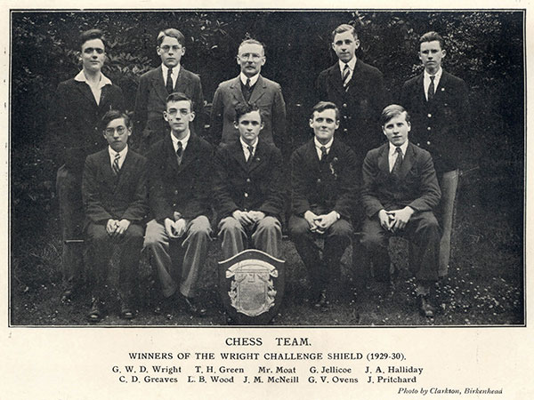Greaves became a member of the school’s chess club. As regular winners of the Wright Challenge Shield Competition for schools across the wider Liverpool region, the club was held in high regard by staff and pupils alike. It was under the guidance of the school’s teacher of French, Charles Moat, of whom the official history seems to hint at a fearsome side, saying that he ‘made an impression both physical and mental’ on those pupils who dared to absent themselves from their French lessons. Greaves avoided the extremes of Moat’s disciplinarianism, as much for his ability at the chessboard as for French lessons, which he later recorded in his personal journal:
