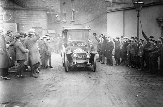 Above: Michael Collins entering Dublin Castle in a taxi on 16 January 1922. (Pathé News)