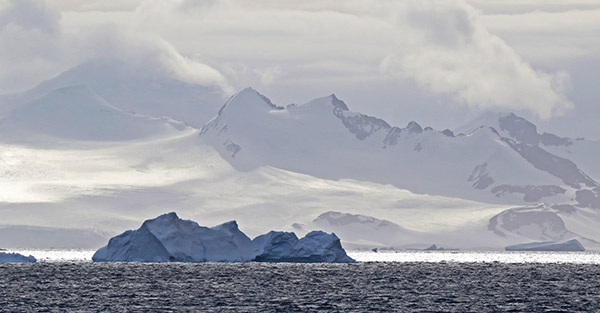 Above: The Antarctic Peninsula, first seen by Edward Bransfield in January 1820. Mount Bransfield is at the top left, with cloud on top. (Jim Wilson)