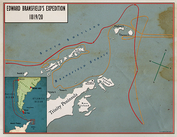 Bransfield had clearly found his calling and remained in the navy when the war came to an end after Napoleon’s defeat at Waterloo in 1815. By 1817 he was master of the veteran frigate Andromache, which had begun life as a French warship before being captured by the British. Under Bransfield’s navigation, the Andromache was posted to the South American port of Valparaiso to safeguard British interests during Chile’s struggle for independence from Spain.
