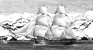 Above: The Williams, the small brig commanded by Ship’s Master Edward Bransfield, making the first sighting of the Antarctic coastline. (Drawing by Jim Wilson)