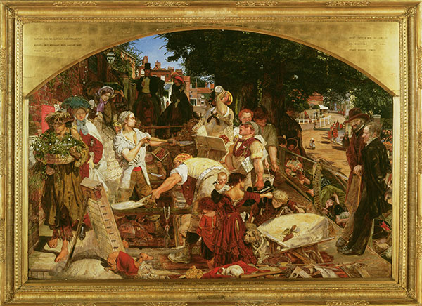 At the left of the picture is an unusual figure, often mistaken for a woman. This is the barefoot groundsel- and chickweed-seller, with his tattered hat. Brown’s catalogue describes how he could have become a criminal had he not found employment. Fortunately, this harmless character now collects plants from the countryside and sells them to botanists in town. Behind him are two wealthy ladies, who do not need to work. The younger of the two exists only to look beautiful and enjoy life, while her older companion spends her free time distributing religious tracts entitled ‘The Hodman’s Haven, or drink for thirsty souls’ to the scornful navvies. In contrast to this temperance campaigner, a prosperous beer-seller, complete with red waistcoat and black eye, shouts ‘Beer ho!’ to attract customers. In the foreground of the painting are a group of impoverished children. They are motherless (as indicated by the baby’s black ribbon), and if they have a father Brown suggests that he will be a heavy drinker and will undoubtedly be ‘sentenced in the police-court for neglecting them’. In the meantime, the girl in the red dress, who can be no more than ten, has been forced to take on the role of caring for the family. And at the apex of the painting, in the background, are a wealthy man and his daughter on their horses. Brown speculates that the man may well be a colonel in the army, with a seat in parliament, and believes that this ‘true-hearted gentleman’ could easily be persuaded to help the poor if he were to listen to the words of Carlyle and Maurice.
