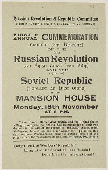 Above: Poster for a Dublin Trades Council commemoration of the first anniversary of the October Revolution in November 1918. The establishment of the Bolshevik government in Russia led to expressions of interest and hope in Ireland. (NLI)