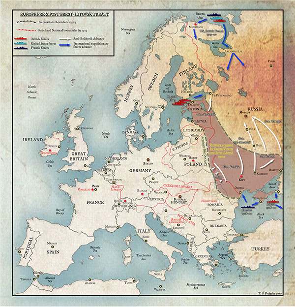 The establishment of the Bolshevik government in Russia led to expressions of interest and hope in Ireland. The pro-Home Rule Freeman’s Journal published Trotsky’s declaration on self-determination on 4 January 1918. In that same month the rather fractionary Irish Left sent a delegation to meet Soviet plenipotentiary Maxim Litvinov in London. Litvinov assured them that in Russia James Connolly was well known. Some 2,000km away, in Brest-Litovsk, the Germans and Russians eventually signed a treaty on 3 March 1918. The Bolsheviks lost much territory, but Lenin believed that Germany was about to be engulfed by revolution and that it was vital that peace be concluded so that the Central Powers were off Russia’s back, which would allow the Bolsheviks to consolidate their revolution and ensure its survival against the counter-revolutionary Whites and other internal enemies.