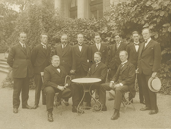 Above: The agreed nationalist candidate for North Fermanagh in the 1918 general election, Kevin O’Shiel, pictured here (standing, fourth from left) with the Irish delegation to the League of Nations in 1923. (UCD Archives)