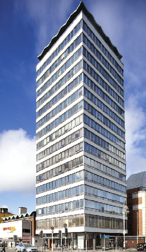 Technologically innovative for late 1950s Ireland, the building was largely constructed in reinforced concrete. The tower’s structure came from eight columns set back from the corners to mask their presence, thus lending the impression of suspended floor-plates branching from the building’s central service core. This effect was achieved through sophisticated technology at foundation level: the tower block was founded on black limestone rock, rooted at about 9m below ground level and filled with concrete, thereby creating a concrete bed on which a circular sub-basement was supported. This sub-basement in turn supported the tower’s eight columns.</>