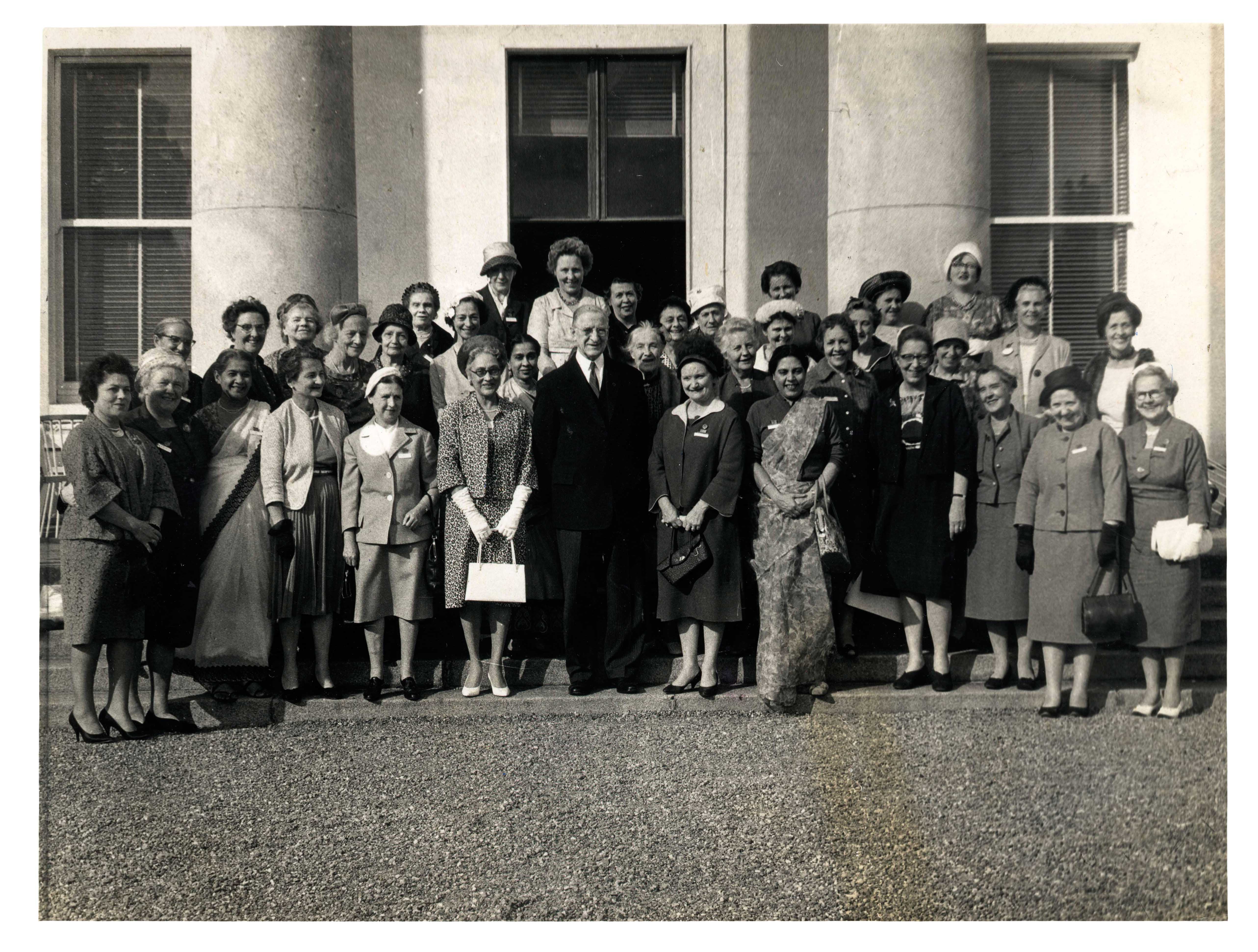 President Eamon de Valera welcoming congress delegates of the International Alliance of Women to Áras an Uachtaráin in 1961. Hilda Tweedy is standing to the right of de Valera; Úna Byrne is just behind her, to the right. (NAI)