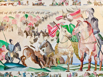 Above: ‘Arrogant Trespass—the Normans landing at Bannow Strand’, panel 3 (of twelve) of the Ros Tapestry, produced between 2000 and 2012, a combined professional and community art project by 150 voluntary stitchers commissioned for St Mary’s Church, New Ross. The 800th anniversary of the landing in May 1969 was ignored by the local press and councils.