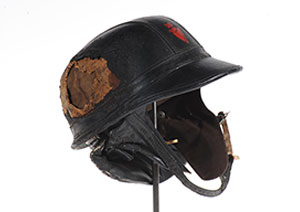 Above: An early 1970s RUC ‘Skulgarde’ helmet, damaged by a petrol bomb during a street riot in Derry.