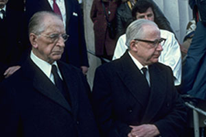 Above: De Valera, with his son Vivion, at his wife Sinéad’s funeral in January 1975. (RTÉ Stills)