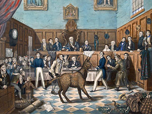 Above: The Trial of Bill Burns—a painting showing Richard Martin with a donkey in an astonished courtroom, leading to the world’s first known conviction for animal cruelty.