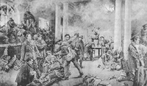 Then, from the dim and distant past, I remembered a black-and-white image portraying the inside of the GPO during the Easter Rising that in those days was reproduced in school books and sometimes displayed as a poster on school walls. But when I went looking for a clean reproduction of the work I had no luck. It seemed to have disappeared from sight and from memory. Eventually the National Museum came to my rescue with a fine black-and-white photograph, which I used to create my own version of the original.
