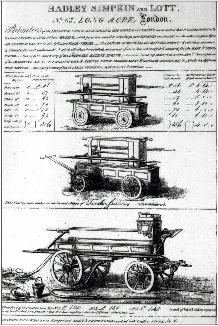 Above: An advertisement for manual fire-pumps, c. 1800.