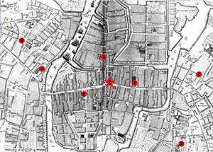 Above: Rocque’s 1759 map of Cork, showing the locations of fire-pumps: (1) City Courthouse, South Main Street; (2) St Fin Barre’s Cathedral; (3) St Nicholas’s, Cove Street; (4) Christ Church, South Main Street; (5) St Paul’s, Paul Street; (6) St Peter’s, North Main Street; (7) St Mary’s, Shandon; (8) St Anne’s, Shandon.