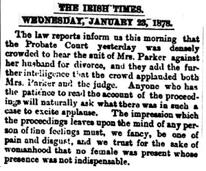 In 1878 a sensational divorce petition came before the Dublin probate and matrimonial court. Sarah Parker, née Ganly, a well-known and unconventional lecturer on women’s rights and spiritualism, sued her husband, Matthew Gibson Parker, a partner in Ganly, Son and Parker, for divorce on the grounds of cruelty. Previously her lecture ‘Are marriage bonds indissoluble?’ was much publicised and criticised. The court was packed with members of the bar interested in the case, as less than 300 divorces were then granted annually.