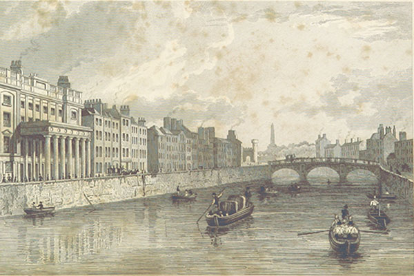 Above: A mid-nineteenth-century view of Ussher’s Quay and Queen’s Street bridge. The pillored building on the left was the premises of Ganly, Son and Parker, the business partnership of Sarah’s father and husband. (British Library)