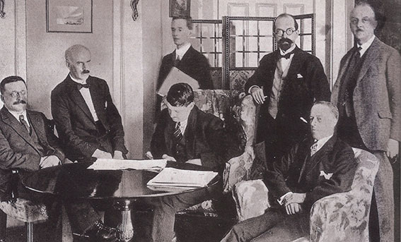 Above: The Irish plenipotentiaries in London—(seated, left to right) Arthur Griffith, Edmund J. Duggan, Michael Collins, Robert C. Barton, and (standing, centre) George Gavan-Duffy.