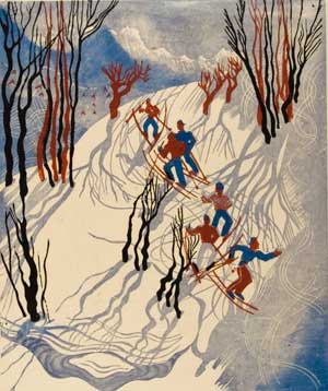 Mother by Tadeusz Kulisiewicz uses a direct composition and stark, graphic style (above). It was informed by long observation, but it was not a study from life. The artist wished to convey a heartfelt representation of ordinary existence and, through the expressive exaggeration of forms, to evoke a way of life. Fleeing to Egypt by Stanisław Ostoja-Chrostowski exemplifies how modern, simplified forms might be employed in a traditional religious subject with no loss of reverence (above). The technique creates a strong, clear image in which the subject is conveyed through monochromatic contrasts, the figures clearly silhouetted with white contours. Among the seven works contributed by Janina Konarska was Skiers, a colour woodcut of a tourist-friendly and fashionable sporting subject of the sort for which she won a silver medal at the art Olympics in Los Angeles in 1932 (above). Other subjects included views of Polish landscapes, towns and cities, as well as scenes of agriculture and cottage industry.
