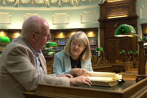 Above: Presenter Michael McDowell with Prof. Mary Daly (UCD), historical consultant and programme contributor, in the National Library of Ireland. (RTÉ)