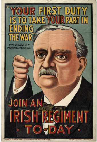 As a loyal subject of the queen (only the year before he died he had subscribed money to a national memorial fund for Victoria), General Redmond strongly disapproved of his nephews’ politics and he allegedly so arranged his affairs that they would be a political burden to John Redmond (elected leader of the IPP in 1900) after his death in 1902. In fact, as John Redmond aged he also became more politically conservative, and his family’s tradition of Catholic loyalty increasingly exerted an influence upon him. As the leader of the IPP at Westminster for eighteen years, he increasingly looked forward not to separation but to a future in which Britain and Ireland would continue to be linked through allegiance to the crown and empire. As revealing of his mature sympathies was his admiration for soldiers. Even during the Boer War, John Redmond and his brother broke ranks and expressed pride in the gallantry of Irish soldiers in the British Army in South Africa (while deploring the war itself), and, according to associates, he always enjoyed talking to old soldiers. This undoubtedly contributed to his decision to call on Irish nationalists to fight ‘wherever the firing line extends’ in the Great War against Germany. In response, Redmond’s critics denounced him as a ‘recruiting sergeant for John Bull’ and recalled that he was, after all, the nephew of one of England’s ‘hired assassins’. In fact, approximately 144,000 Irishmen enlisted, including General Redmond’s nephew Willie—who fell at Messines Ridge in 1917—and the general’s great-nephew, W.A. Redmond, who was awarded the DSO.