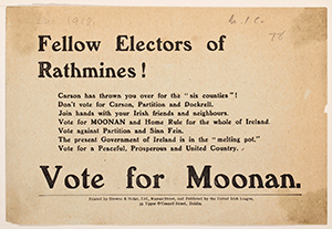Above: Handbill seeking support for United Irish League (IPP) candidate George Moonan in the general election of December 1918. Sinn Féin also stood a candidate in Rathmines, splitting the nationalist vote, allowing Dockrell to be the only Unionist elected outside of Ulster and Trinity College Dublin. (NLI)