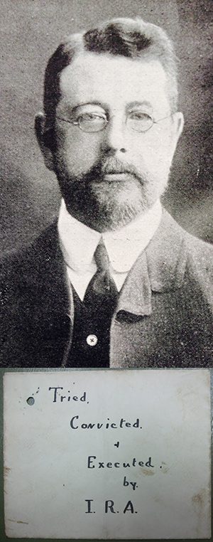 Top: Alfred Reilly, manager of Thompson’s Bakery in Cork, was shot by the IRA as a suspected spy on 9 February 1921. Pinned to his chest was an envelope on which the words ‘Beware of the IRA’ had been written in pencil. Like a third of the alleged spies killed in County Cork, Reilly was a Protestant.