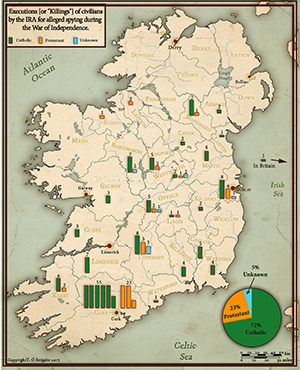There has been an animated debate amongst historians as to the veracity of these claims. Much of the groundwork was laid by Peter Hart, who, taking Cork as a case-study, claimed that the majority of those executed for spying were innocent and that such killings often had more to do with prejudice against Protestants and ex-servicemen than genuine concerns about military security. Hart suggested that such killings were part of a national campaign of sectarian violence against Protestants that was tantamount to ‘ethnic cleansing’. In fact, the overwhelming majority, 132 of the 184 civilians killed by the IRA as alleged spies (c. 72%), were Catholic; just 43 (c. 23%) were Protestant. The execution of Protestants accused of spying was not widespread nationally. The IRA did not kill any civilians accused of spying in Antrim, Derry, Donegal, Down, Fermanagh, Mayo, Tyrone or Wicklow. Furthermore, Catholics accounted for all of those shot as spies by the IRA in Armagh, Carlow, Cavan, Clare, Galway, Kildare, Kilkenny, Limerick, Louth, Meath, Waterford and Wexford. On the face of it this belies the assertion that the IRA in these counties exploited the intelligence war as a pretext for sectarian murder or ‘ethnic cleansing’.