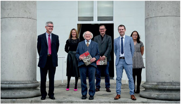 Above: Editors Tommy Graham, Grace O’Keeffe, Brian Hanley and Darragh Gannon, and Wordwell’s Courtney FitzMaurice, at a presentation of History Ireland’s latest supplement, The Split—from Treaty to Civil War 1921–23, to President Michael D. Higgins at Áras an Uachtaráin on 8 October 2021. (Maxwell Photography)