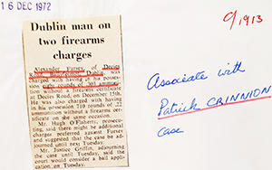 The third man was 31-year-old Englishman Alexander Forsey (reported as ‘Fursey’). Gardaí initially thought him ‘sympathetic to the IRA’. On 15 December 1972 he appeared in court, charged with possession of explosive safety fuse, 710 rounds of .22 and eight rounds of .303 ammunition. Under interrogation, Forsey told Gardaí that he was in contact with a fellow Englishman, John Wyman. Forsey’s connection to the Wyman–Crinnion saga is revealed officially in a handwritten instruction within a Military Archives file in Cathal Brugha Barracks. Beside a newspaper report of Forsey’s first court appearance is written, ‘Associate with Patrick Crinnion case’ (see illustration on p. 48). Citing his subject’s papers, Dermot Keogh’s 2008 biography of Jack Lynch mentioned the link, as did Conor Brady’s The guarding of Ireland (2015), quoting a former detective sergeant.