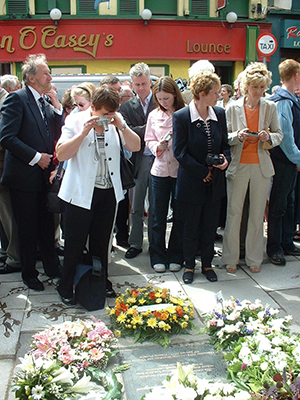 Above: Family and friends at the unveiling on 22 July 2004, organised by Justice for the Forgotten, of a permanent memorial to the three CIÉ workers killed in the bombings—George Bradshaw and Tommy Duffy in December 1972 and Thomas Douglas in January 1973. All three died in Sackville Place, just off O’Connell Street. (An Phoblacht)
