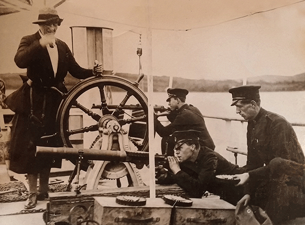 Above: ‘Admiral’ Mrs Hazel Laverton aboard ‘HMS’ Pandora, flanked by heavily armed ‘A’ Specials.