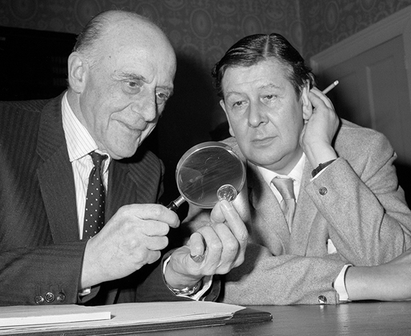 Deputy Master of the Royal Mint Sir Jack James (left) with coin designer Christopher Ironside (right), c. 1968. (Alamy)