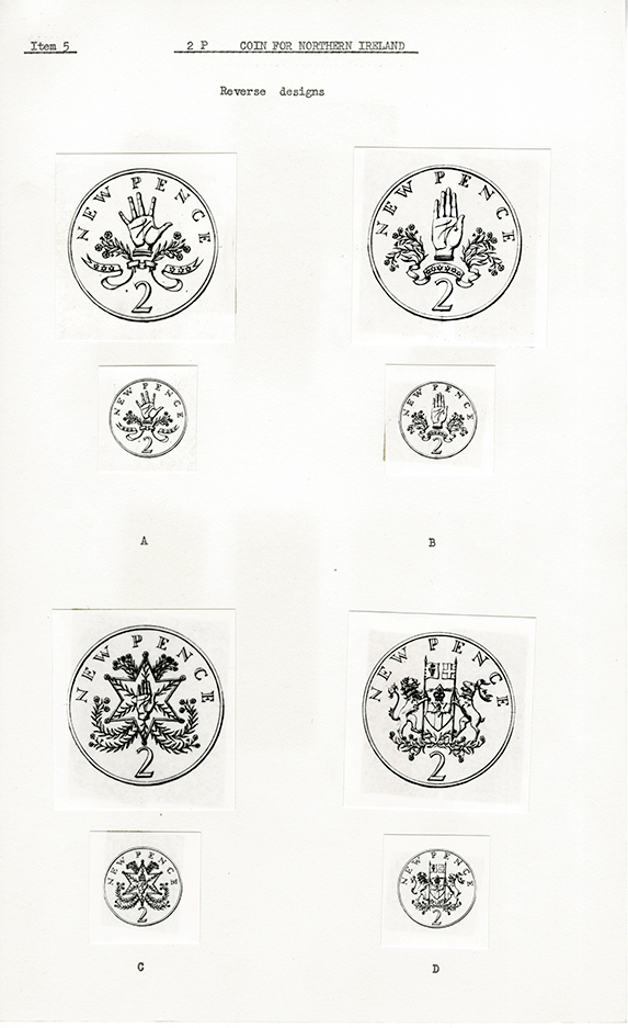 When Ironside was informed of this, his reaction reflected exasperation with the escalating political crisis and sectarian intransigence. He humorously proposed two rival designs, struck ‘for use on opposite sides of the barricades’, inscribed ‘(1) “Bogside über Alles” (2) “Apprentices arise, you have nothing to lose but your oranges”’. Suspending disbelief, he produced four designs for the RMAC meeting in November 1970. Three were variants of the Red Hand, one which looks today like a high-five gesture (A), another with the fingers closed (B) and the third within a six-pointed star, as used on Northern Ireland stamps (C). Each design was ornamented with flax and uncrowned. Design D depicted the Northern Ireland government arms. Ironside believed that A best matched the companion twopence coin, B was ‘forbidding’ and C was distinctively different from the approved Welsh and Scottish designs. While D was, so he thought, ‘symbolically non-controversial’, its basic shape occurred ‘on very many coins all over the world’. When officials previewed the designs, however, they expressed concern that the arms were of the government of Northern Ireland rather than of Northern Ireland itself. As the nationalist minority was largely hostile to the government, D could pose problems: contrary to Ironside’s assumption, it too was potentially controversial. B was preferred to A, as its closed fingers resembled the traditional heraldic symbol more closely. Indeed, Sir Harold Black, secretary to the Northern Ireland cabinet, advised that the ‘spread hand’ should ‘certainly not’ be adopted.